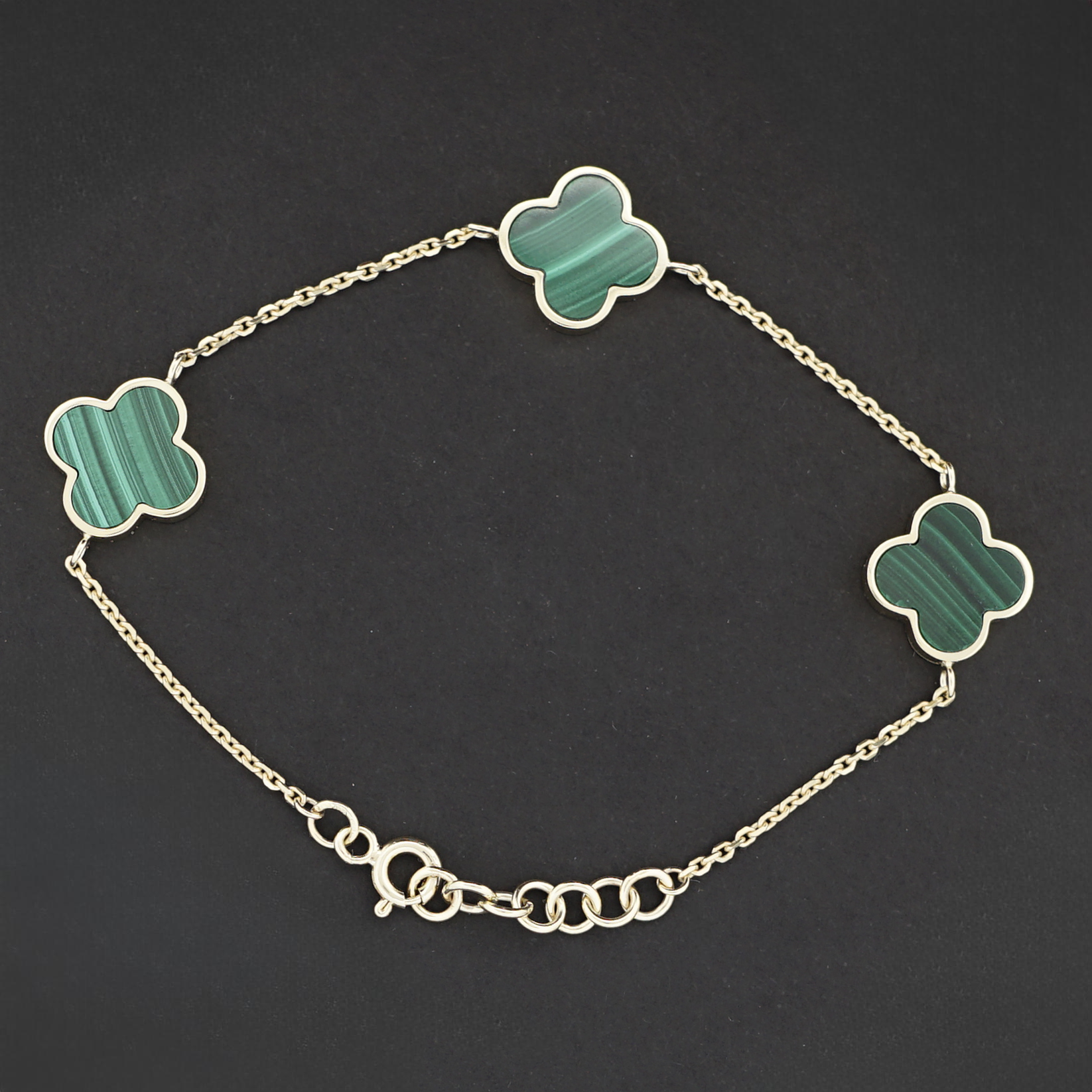 Tento kvalitný elegantný zlatý náramok je unikátnym spojením precíznej ručnej práce a prírodnej krásy. Je ozdobený 3 malachitmi v tvare štvorlístka a personalizovaný gravírom zo zadnej strany.