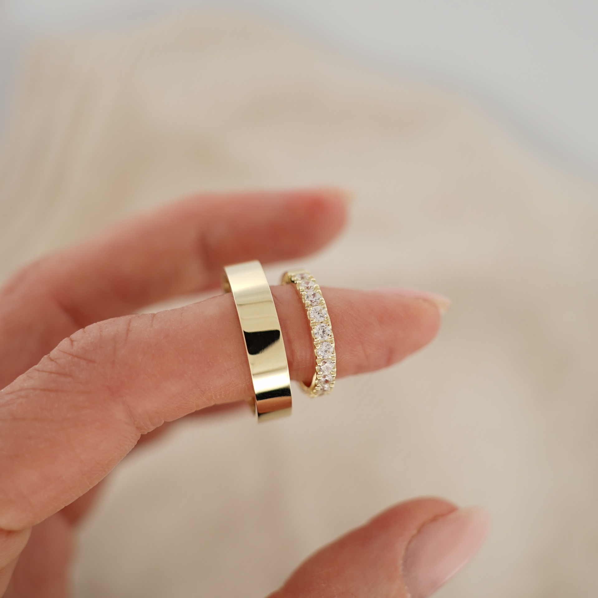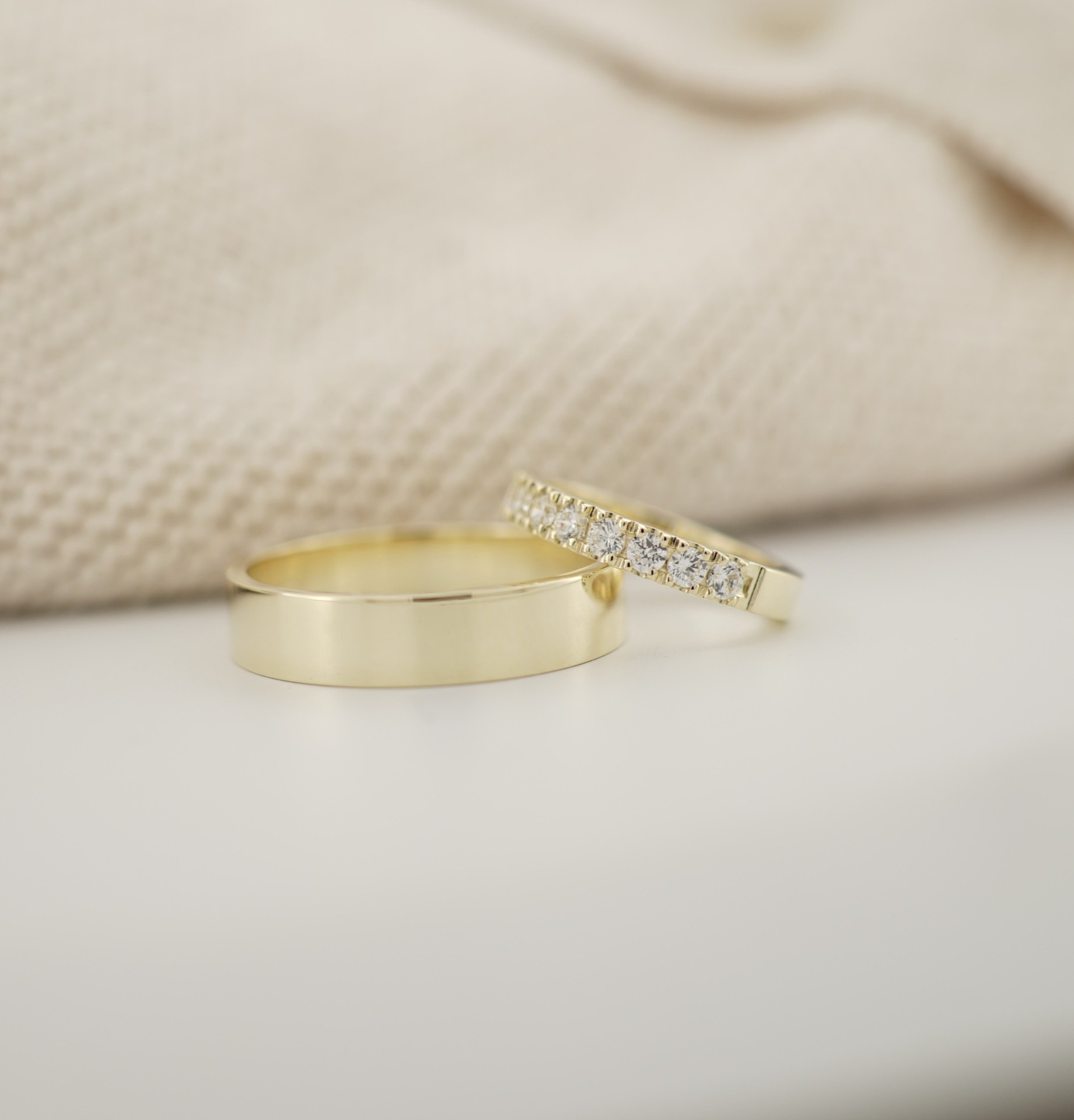 Elegantné zlaté obrúčky zo 14 karátového zlata s líniou žiarivých kamienkov.