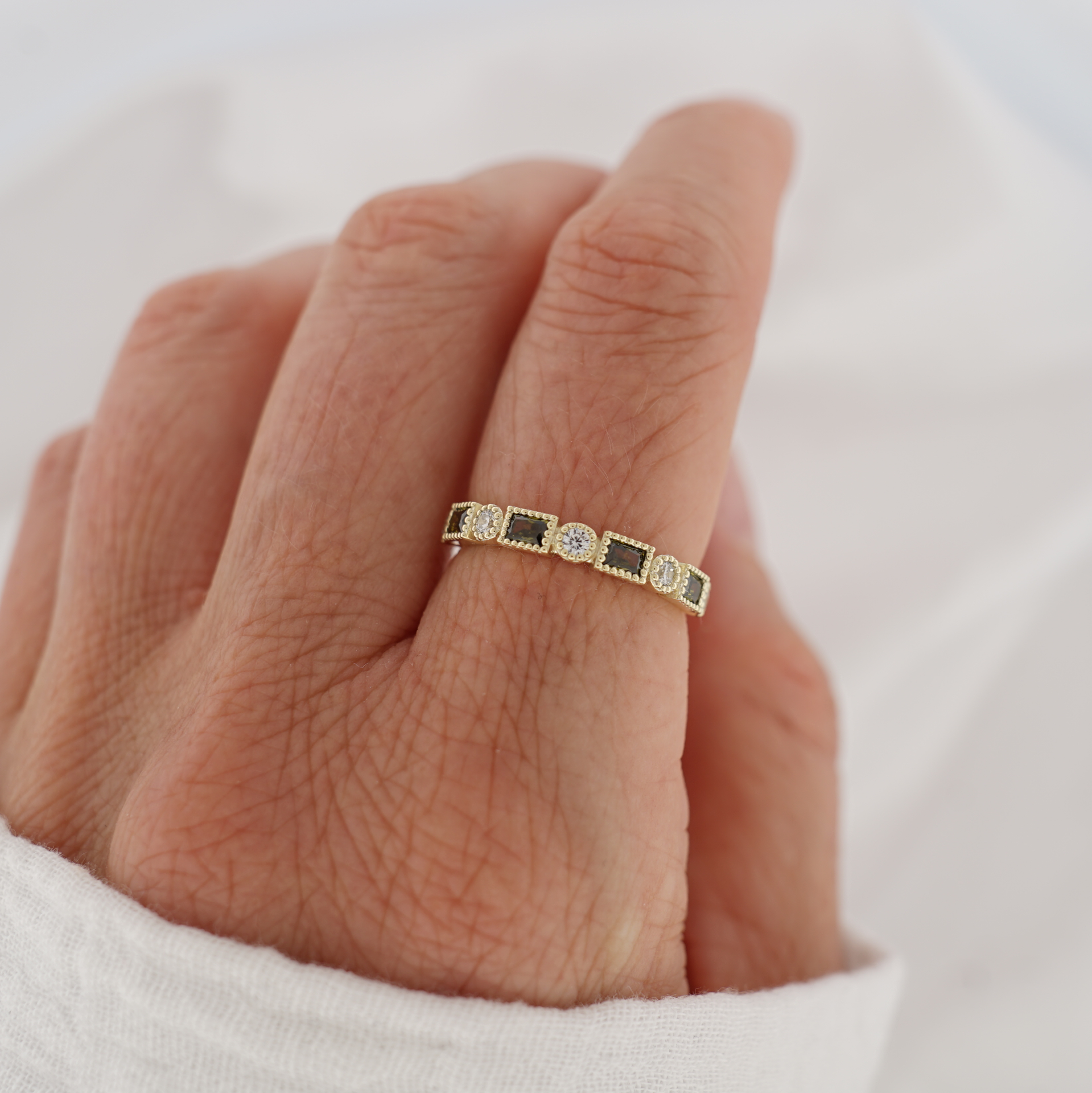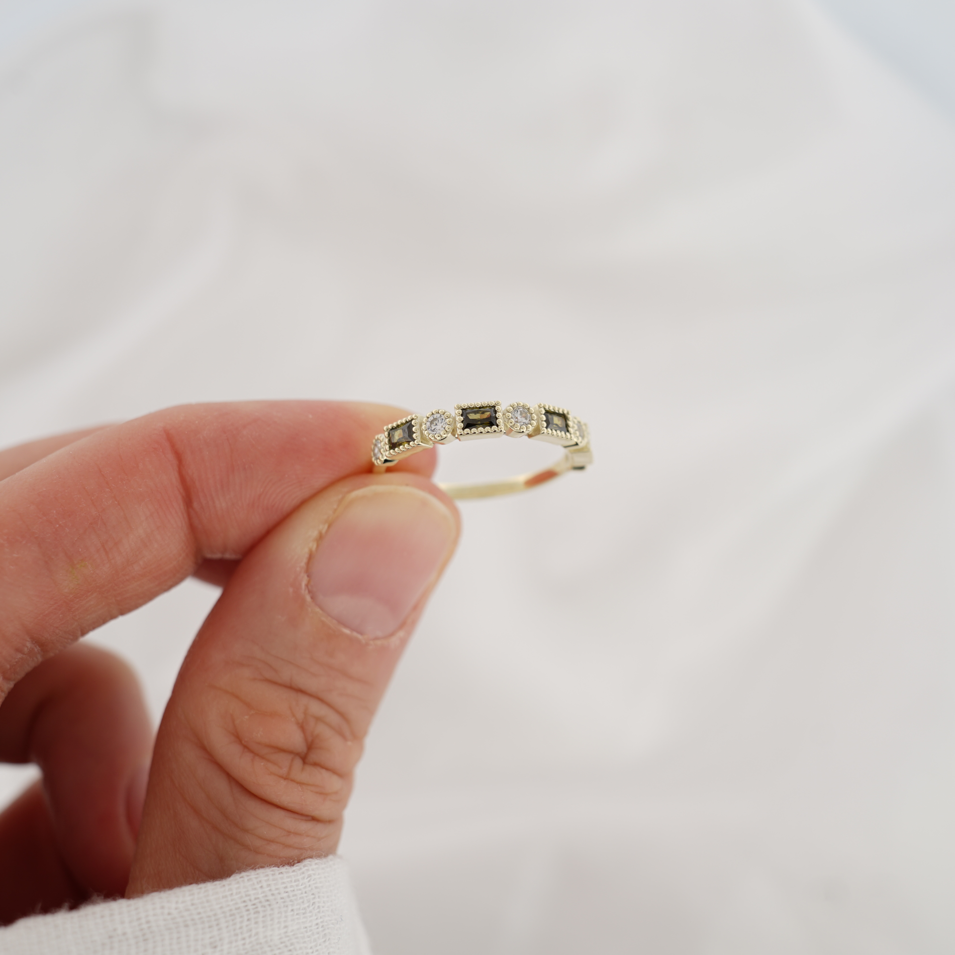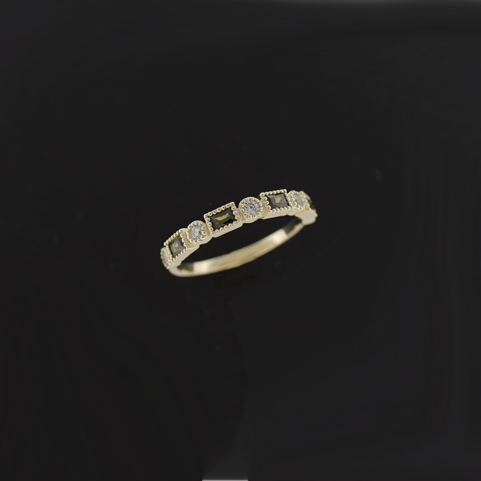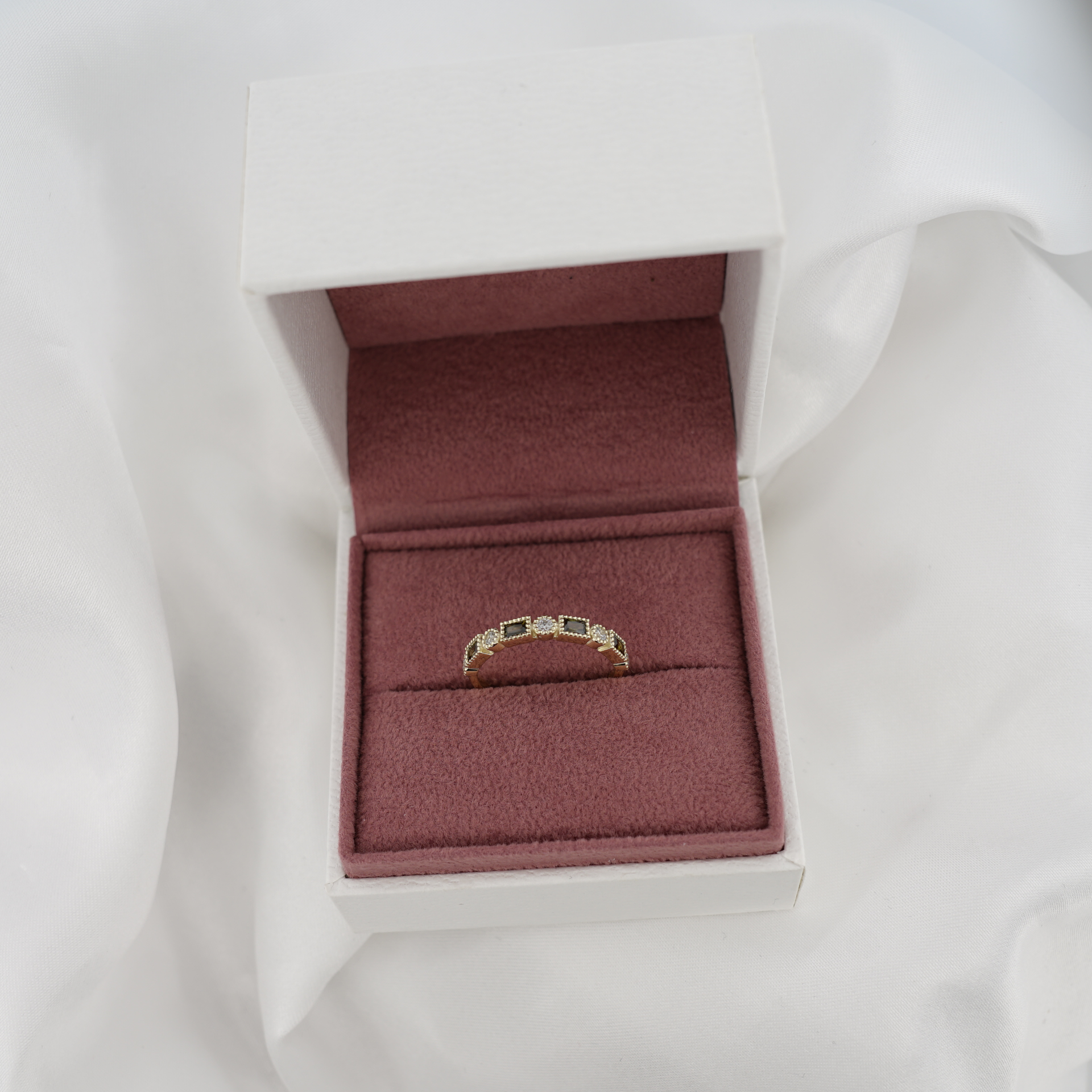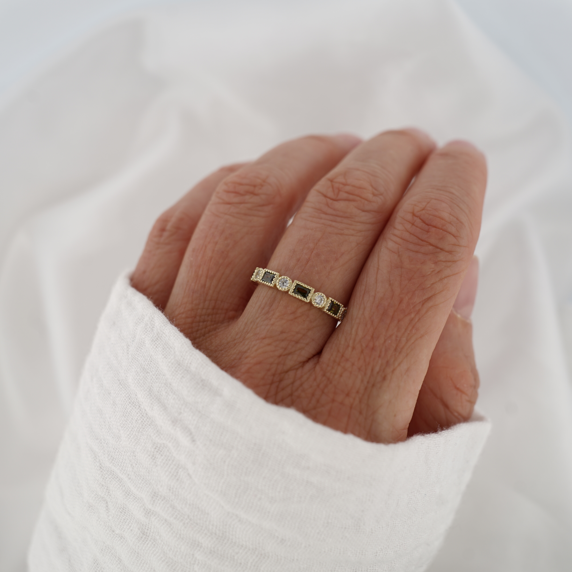 Elegantný a originálny prsteň vyrobený zo 14-karátového zlata spája klasickú krásu s moderným dizajnom. Kombinácia tmavo zelených obdĺžnikových a čírych okrúhlych kameňov vytvára jedinečný kontrast, ktorý zaujme na prvý pohľad. Jemné detaily po obvode kameňov dodávajú prsteňu luxusný a prepracovaný vzhľad.