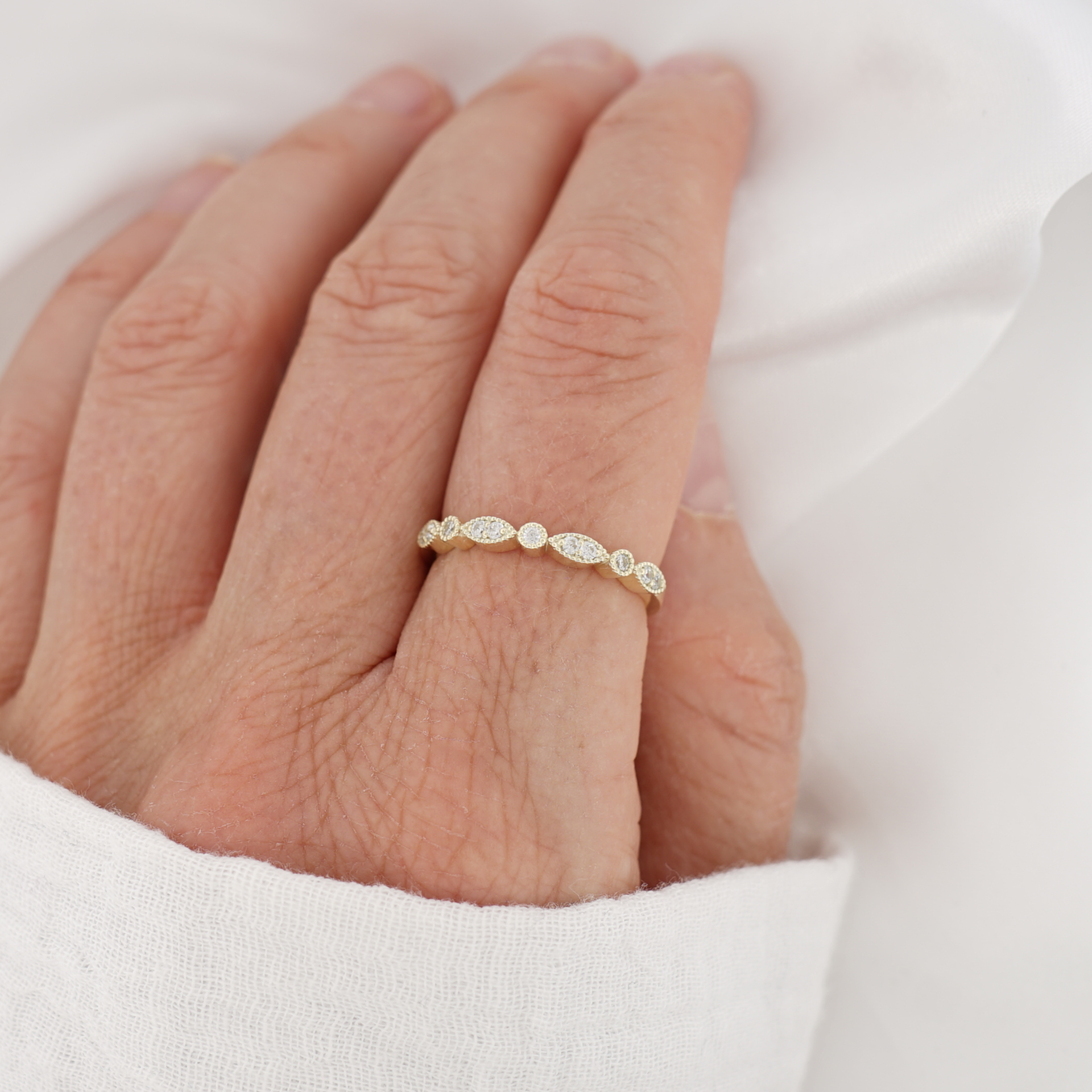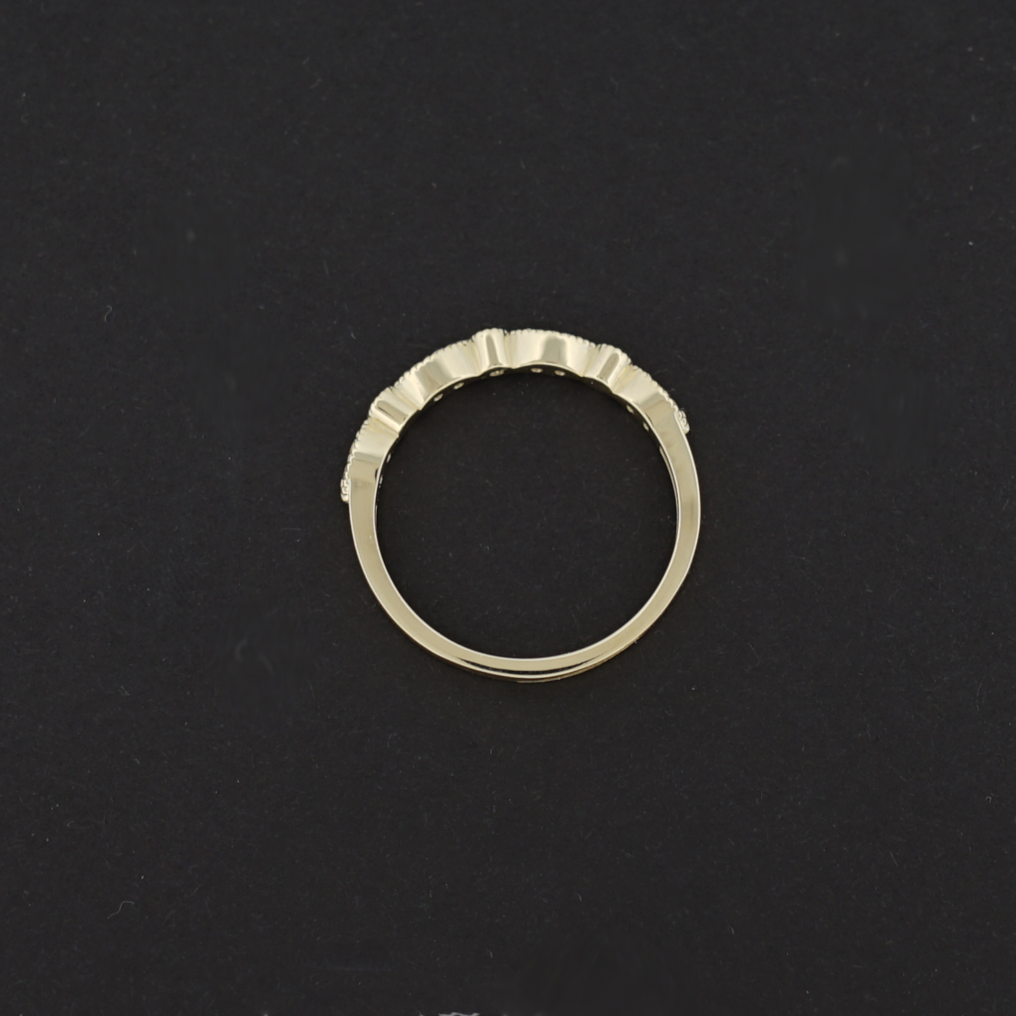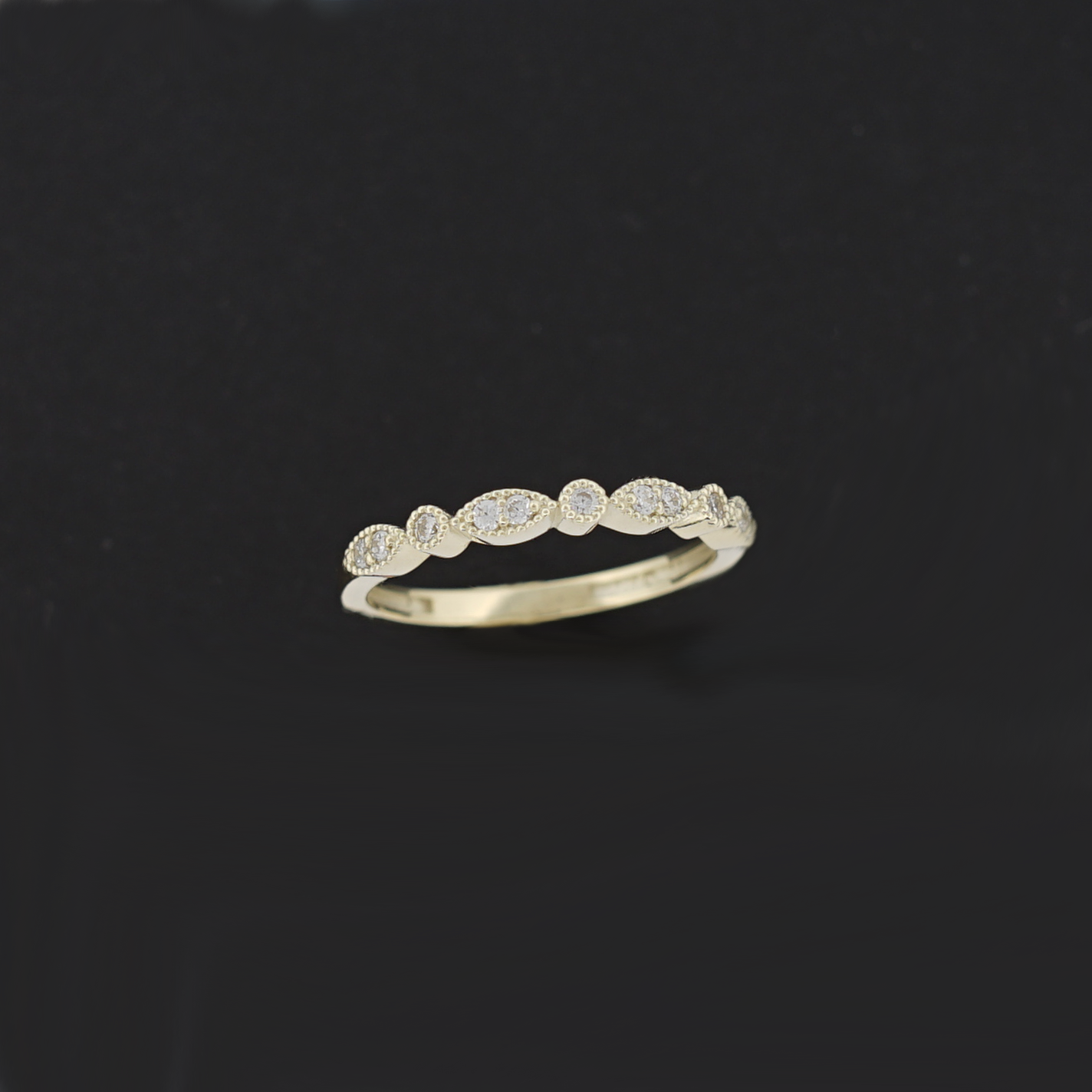 Nežný a ženský prsteň, ktorý zaujme svojím elegantným dizajnom a precíznym spracovaním. Vyrobený zo 14-karátového žltého zlata, zdobený drobnými čírymi zirkónmi osadenými do striedajúcich sa oválnych a okrúhlych tvarov.