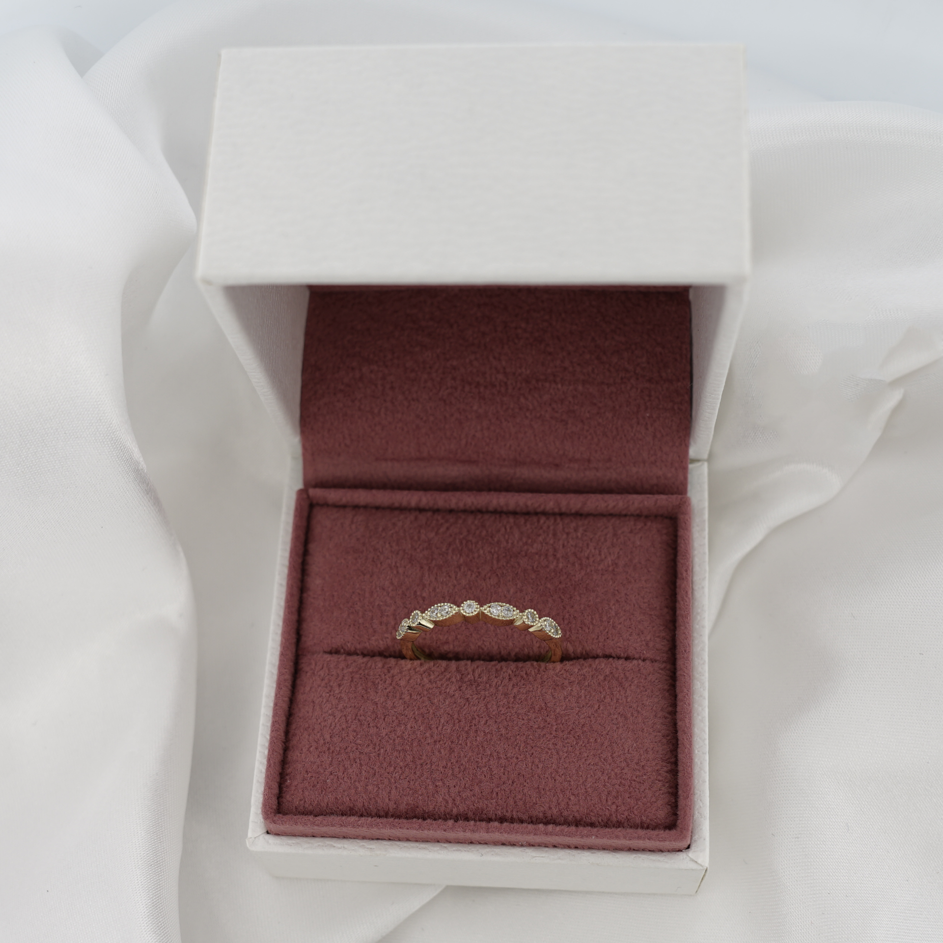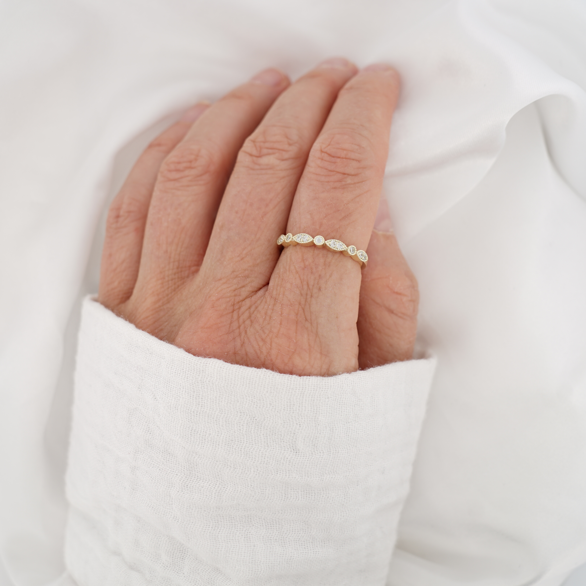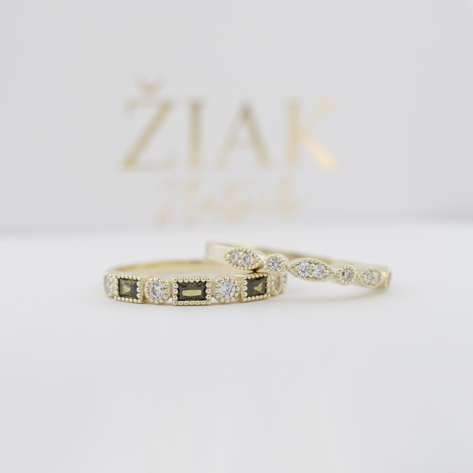 Nežný a ženský prsteň, ktorý zaujme svojím elegantným dizajnom a precíznym spracovaním. Vyrobený zo 14-karátového žltého zlata, zdobený drobnými čírymi zirkónmi osadenými do striedajúcich sa oválnych a okrúhlych tvarov.