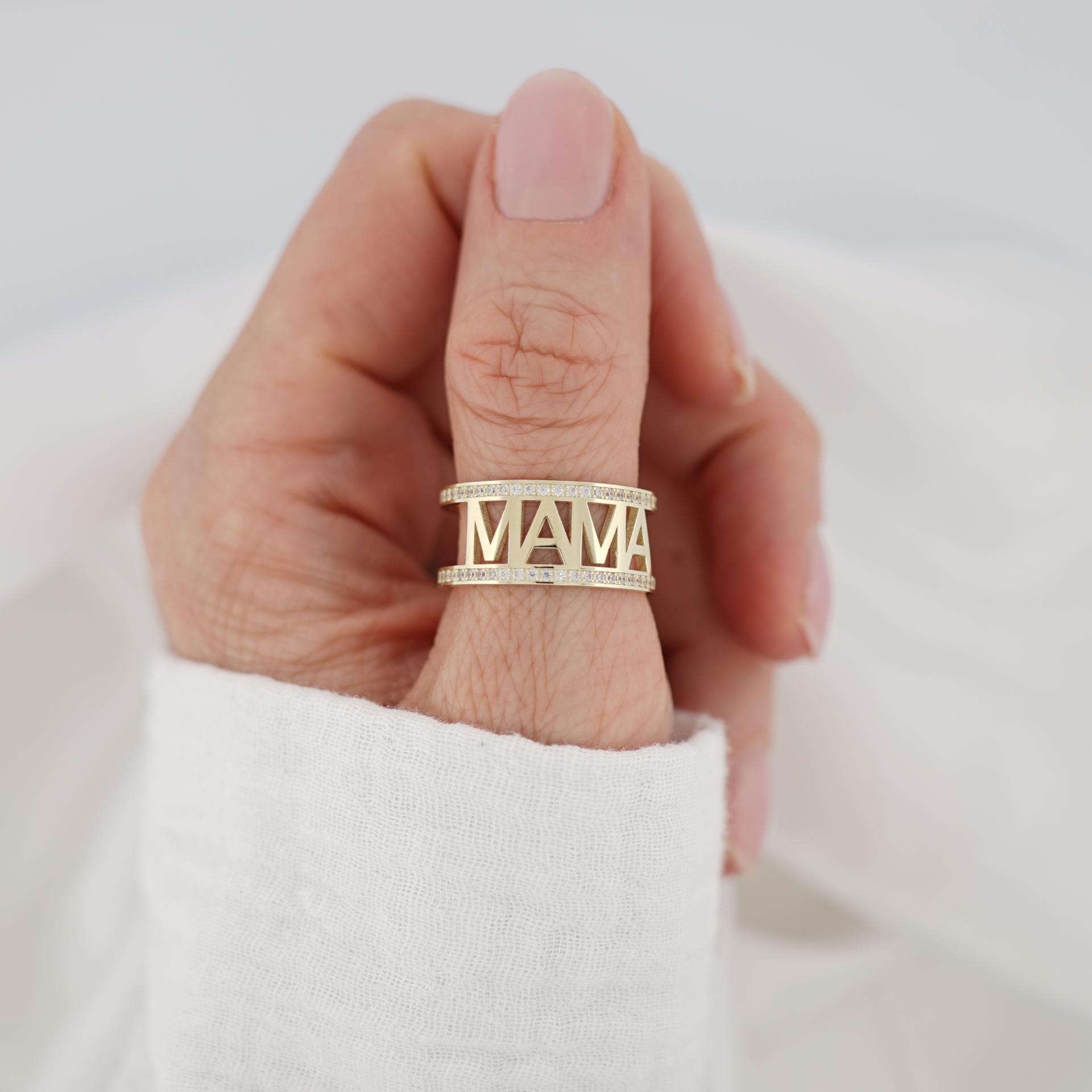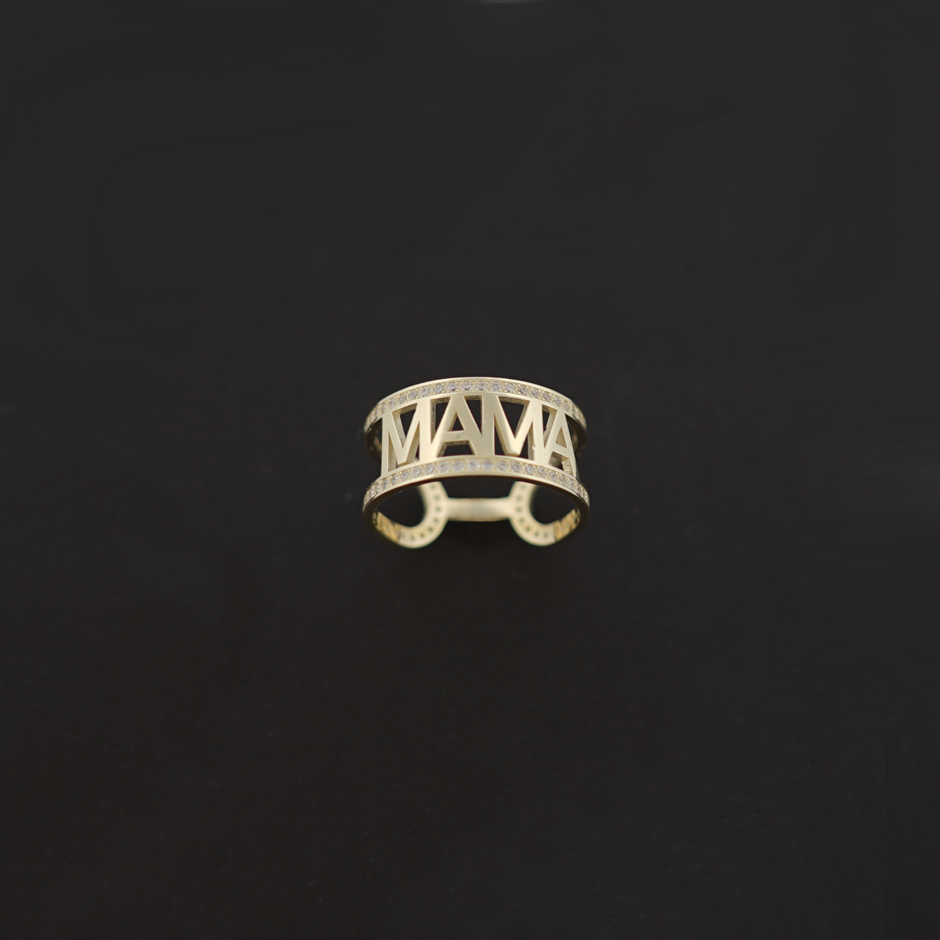 Oslava najkrajšej roly v živote ženy. Zlatý prsteň MAMA je nežným, no výrazným symbolom lásky, vďaky a materstva. Elegantný otvorený dizajn s vyrezaným nápisom "MAMA" je doplnený jemným lemovaním drobnými kamienkami, ktoré prsteňu dodávajú jemný lesk a luxusný vzhľad.