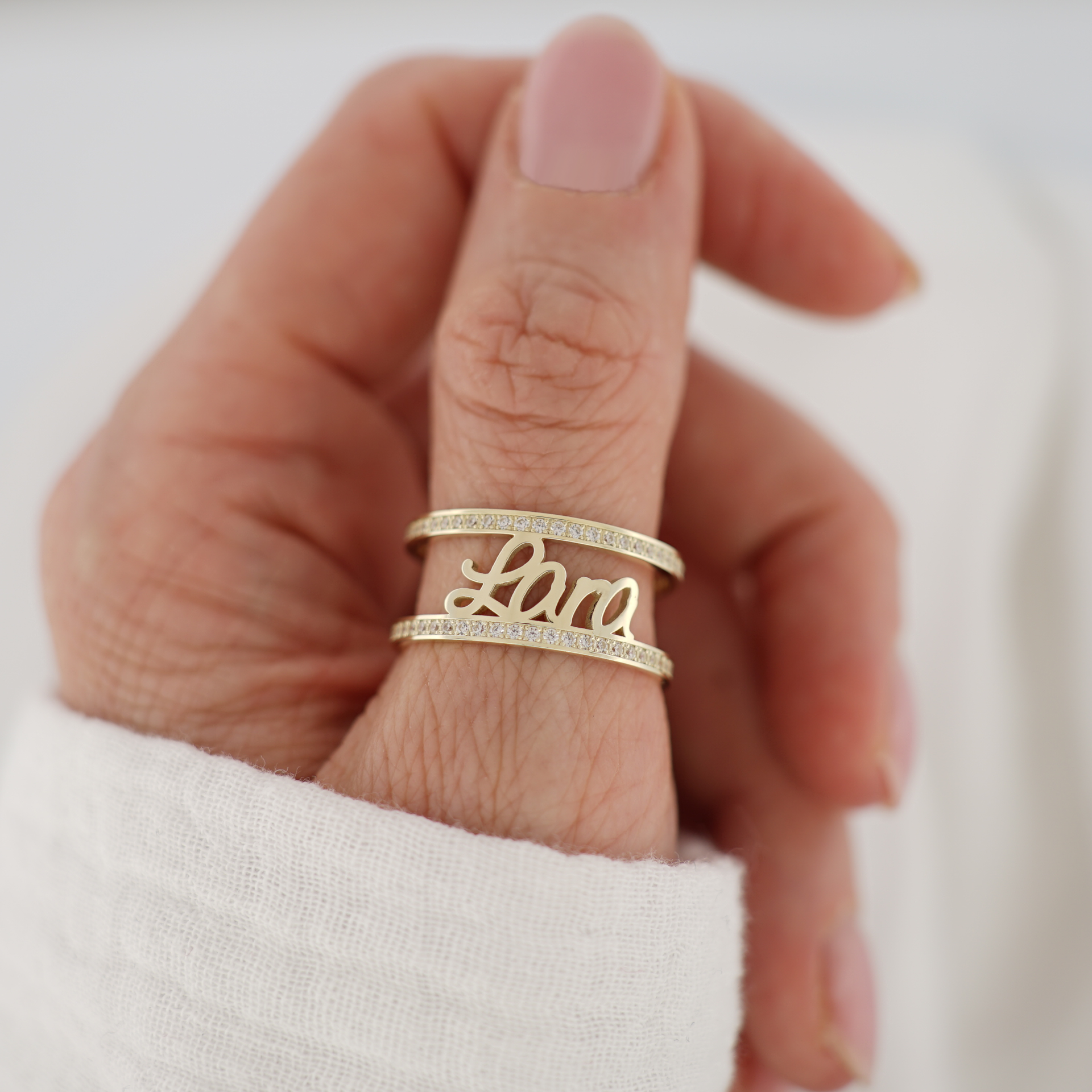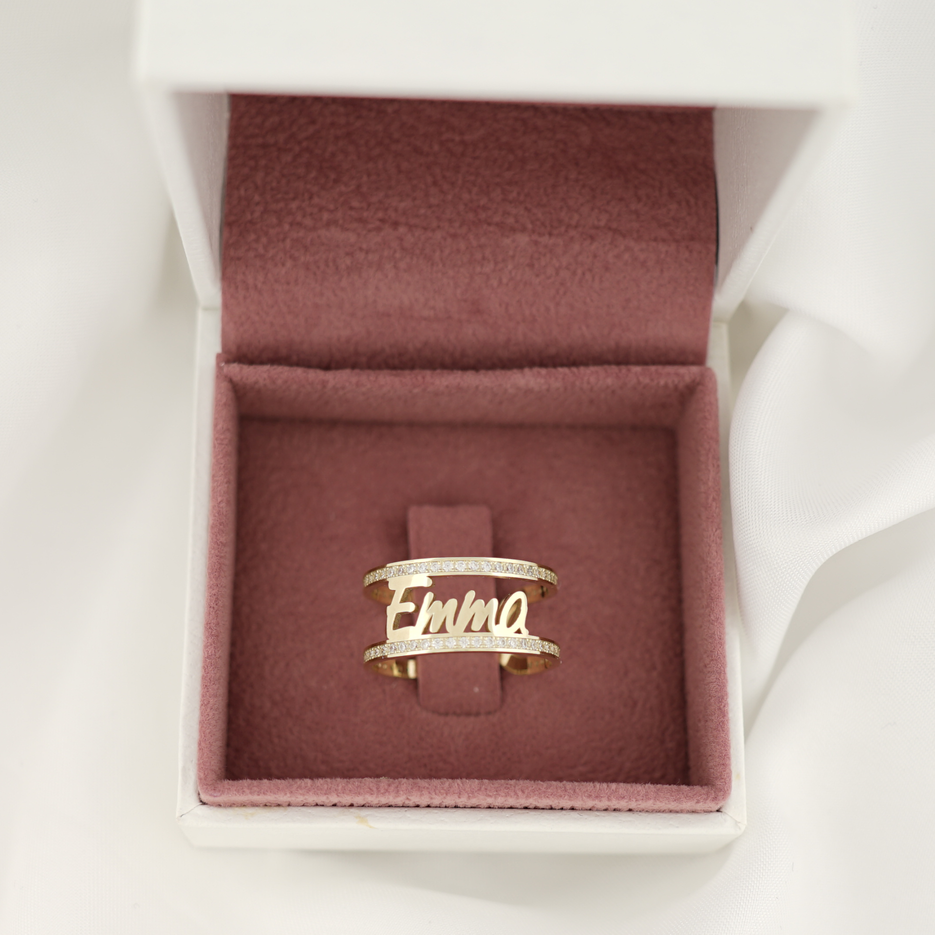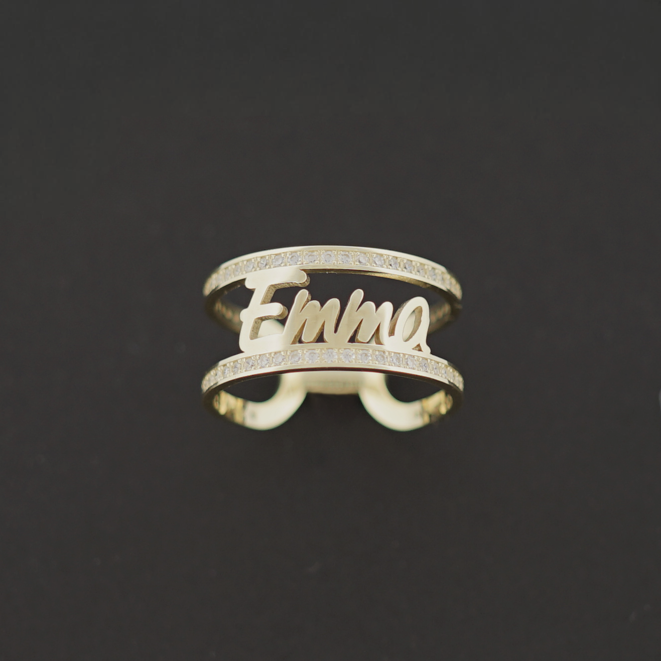 Doprajte si jedinečný šperk, ktorý nesie meno, na ktorom vám záleží. Tento personalizovaný zlatý prsteň je navrhnutý v modernom dvojitom prevedení – meno je elegantne vsadené medzi dve jemné línie osadené trblietavými zirkónmi. Je to osobný šperk, ktorý má hodnotu – nielen materiálnu, ale aj emocionálnu.