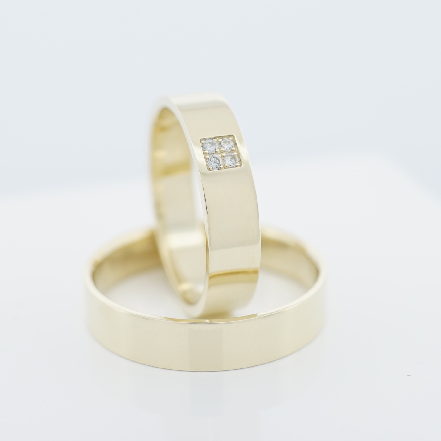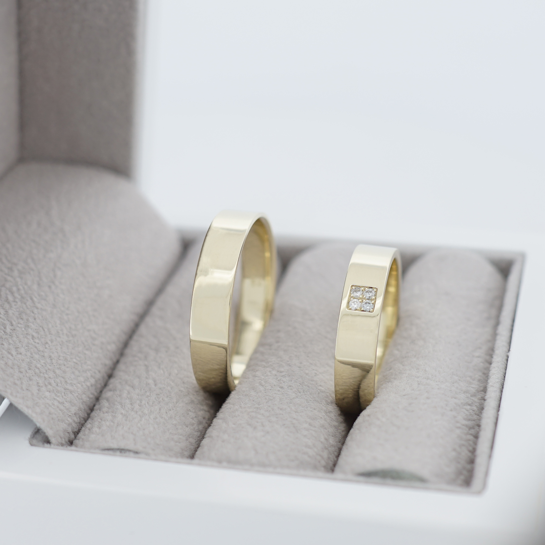 Moderné ploché obrúčky zo 14 karátového zlata, zdobené zirkónmi.